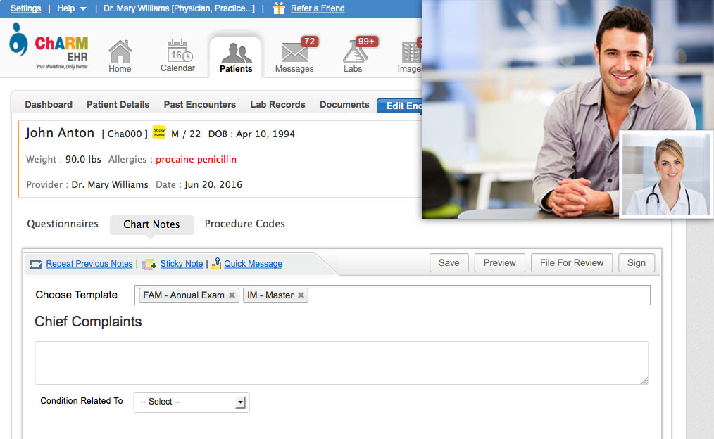 The ChARM TeleHealth solution has multiple components, providing the practitioner with a video communication platform integrated with the EHR, with the ability to capture chart notes and access patient data simultaneously, while engaging with the patient on the video feed. The patient can log into the TeleHealth app from a browser or a mobile device, thus enabling convenient access from any location accessible with internet service. In addition, TeleHealth appointment scheduling, payment processing and legal paperwork, are all handled through a seamless workflow, integrated with the ChARM Practice Management system. The design also enables the practice to provide a secure HIPAA compliant service to customers, by integrating archiving, record retention and secure visit summaries that can be shared through ChARM PHR (our free Patient Portal).