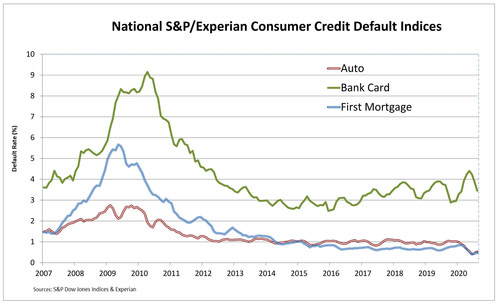 NEW YORK, Sept. 15, 2020 /PRNewswire/ -- S&P Dow Jones Indices and Experian released today data through August 2020 for the S&P/Experian Consumer Credit Default Indices. The indices represent a comprehensive measure of changes in consumer credit defaults and show that the composite rate was up one basis point to 0.67%. The bank card default rate fell 41 basis points to 3.45%. The auto loan default rate rose six basis points to 0.53% and the first mortgage default rate was four basis points higher at 0.48%.