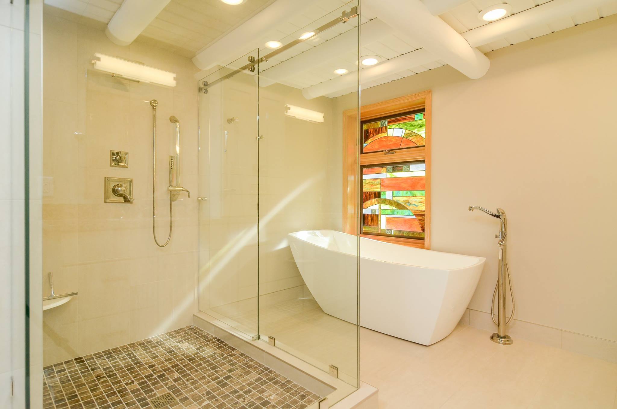 The old shower and commode room was turned into just its own water closet connected to the master bath. The master bath was updated with white cabinets, granite countertops, natural stone tile, LED recessed lighting, in-floor heat on a programmable thermostat, a beautiful free-standing tub, a shower surrounded by heavy glass with a barn-style sliding glass door, and a shower head/handheld with multiple controls.