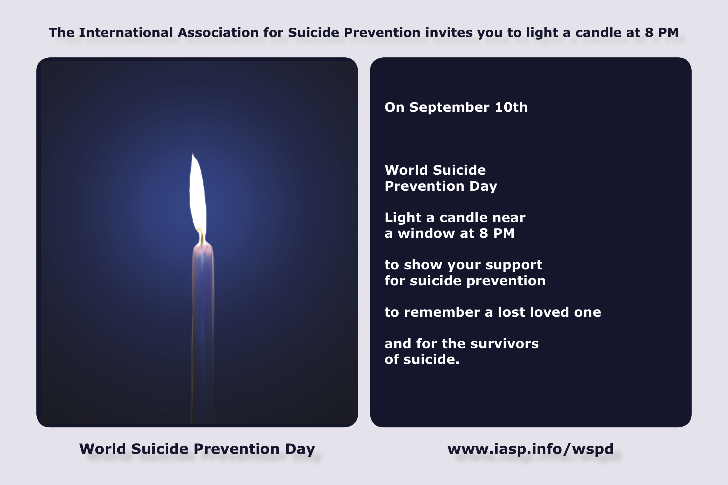 - IASP encourages people to light a candle near a window at 8 p.m. in support of WSPD, to remember a loved one lost to suicide and for the survivors of suicide. IASP is also encouraging people who light a candle to post a video or photo on the Facebook Event Page. Light a Candle Near a Window e-cards in over 30 languages, can be downloaded for free at: https://iasp.info/wspd2017/light-a-candle.