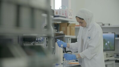 ندى الخراشي، من المشتركين النهائيين للموسم السادس عشر من "نجوم العلوم"، تعمل في المختبر على تطوير مشروعها خلال مرحلة التنفيذ.