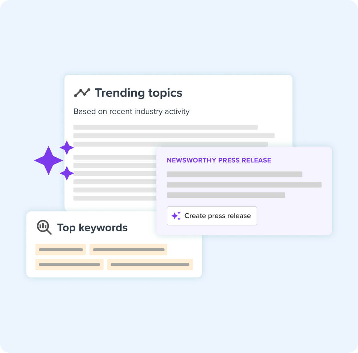 Keep a pulse on the market with industry insights featuring trending topics and relevant stories. Search for a topic, brand or industry and let AI suggest newsworthy press release ideas. Our tool surfaces trending questions, keywords and hashtags so you can quickly understand what’s resonating with audiences.
