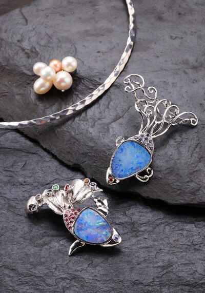 使用材質:銀、澳洲黑蛋白石、天然紅寶石、天然藍寶石、沙佛萊石、彩色剛玉