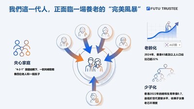 香港人口老齡化加速,2024 年 65 歲及以上長者已佔總人口逾 22%。「4-2-1」家庭結構與少子化趨勢令「養兒防老」模式難以為繼。中產家庭正面臨三大養老痛點:長壽風險(錢比人先用完)、失智失能風險(錢用不了),以及市場波動下的財富侵蝕風險。傳統家族信託高門檻、高收費及繁瑣流程,則讓絕大多數中產家庭望而卻步。