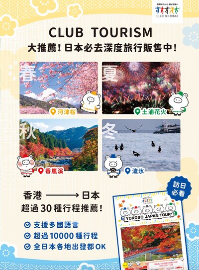 東京2025年9月22日 /美通社/ -- 日本知名旅行社Club Tourism正式宣布,將參展2025年9月25日至28日在香港舉辦的「香港秋季旅遊博覽會2025(HTE2025)」。展位將介紹多款推薦旅遊行程,包括秋季紅葉鑑賞、冬季雪鄉溫泉體驗等精彩內容。