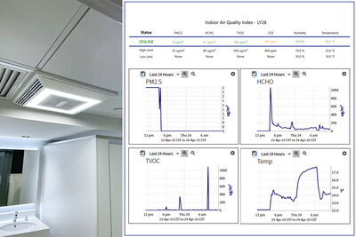 安裝後的空氣監測數據顯示出顯著改善:在短短24小時內,局部區域的甲醛(HCHO)濃度從1060 μg/m³大幅降至40 μg/m³,降幅達96%;總揮發性有機化合物(TVOC)亦從1090 μg/m³降至約190 μg/m³,降幅達83%。即使在商業空間環境本身動態多變的情況下,系統仍能穩定地將PM2.5、HCHO與TVOC濃度維持於極低水平,顯示其卓越的可靠性與效能,並超越多項嚴格的專業空氣質素標準。
