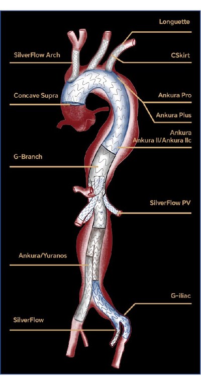 為攻克原位開窗技術瓶頸,舒暢教授團隊與先健聯合研發了全球首創的主動脈原位開窗分支重建創新產品矩陣,即Ankura Plus原位開窗分支重建主體支架和原位開窗自適應防漏CSkirt裙邊分支支架。