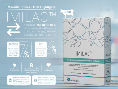 NESS ZIONA, Israel, Aug. 8, 2023 /PRNewswire/ -- Mileutis, an Israeli-based biopharmaceutical company that is leading the dairy industry and animal health into a sustainable future, has completed a rigorous, randomized, case-controlled, multi-center, clinical field trial. The trial was conducted at seven different commercial dairy farms and involved over 500 dairy cows. The results of this trial provide further conclusive evidence of the ability of Imilac™, therapy to completely substitute the routine use of antibiotics at dry-off in the dairy industry.