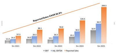 In the first nine months of 2025, the group's sales totaled $200.5 million, representing an increase of 49.0% compared with the same period last year, including double-digit organic growth of 14.0%.