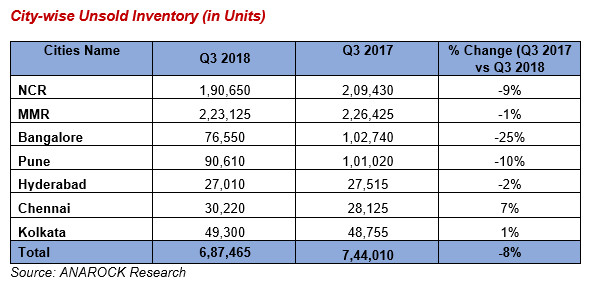 Bengaluru's real estate market has outperformed all other cities in terms of shedding unsold housing inventory, says the latest report by ANAROCK Property Consultants. The report, released at ACETCH 2018 in Bengaluru last Friday, confirms that Bengaluru saw a remarkable decline of 25% in the total unsold stock across the top cities.