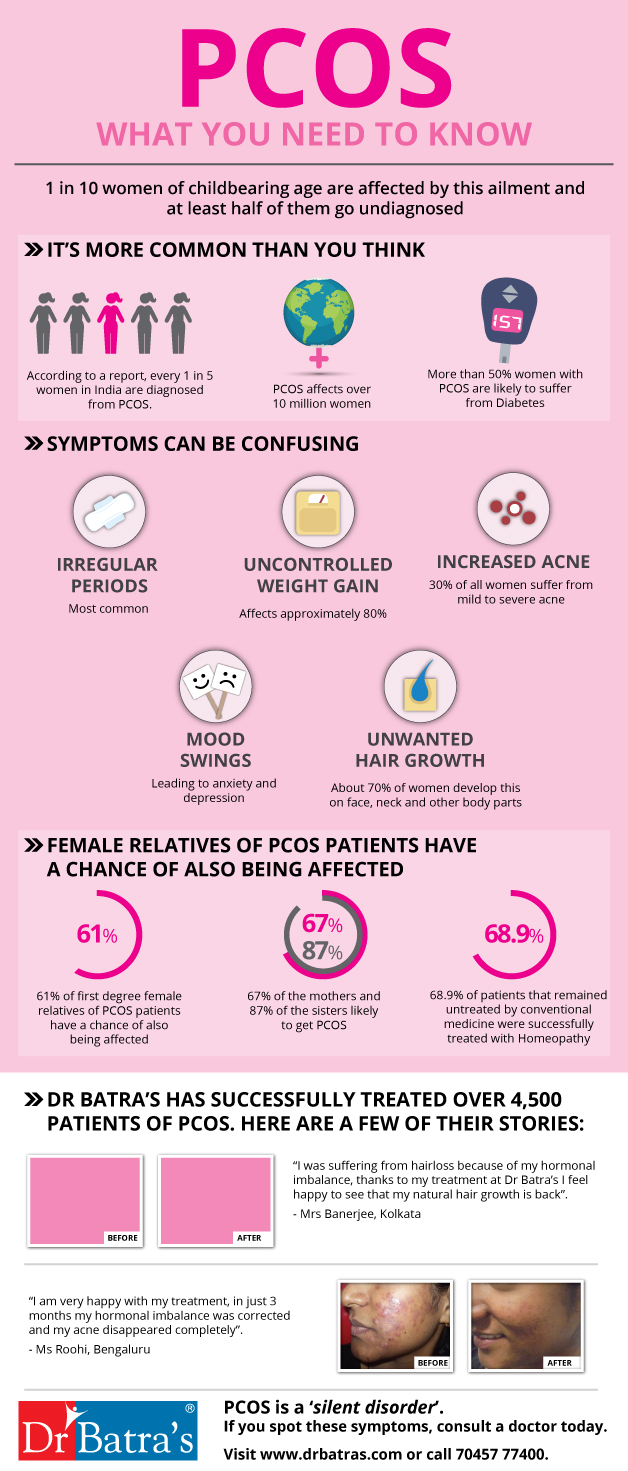 Women with PCOS produce a larger amount of male hormones and not enough female hormones, which effects ovulation. In patients of PCOS, the ovaries are typically enlarged and may even contain multiple small cysts. Women know their bodies best and they need to gauge whether their mood swings, uncontrolled weight gain, increased acne, irregular periods and unwanted facial hair growth are the result of an underlying issue i.e PCOS.