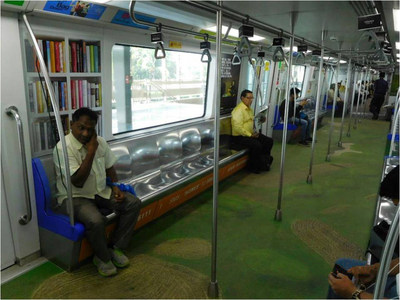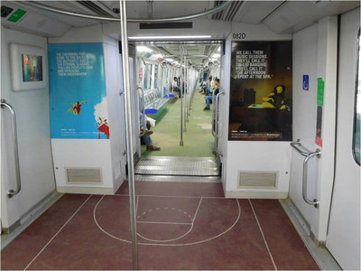 Those commuting on train no. 8 from Versova to Ghatkopar will be pleasantly surprised to step into the environs of the Rustomjee Urbania Township. The innovative floor wrap has been designed in such a way that each compartment has a different look - swimming pool, mini golf course, basketball court and football field. The walls too complement the effect and display pictures that highlight the concept of living in large, green, open spaces where 'childhood's available' for every child who lives there.