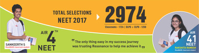 Managing Director of Resonance R.K Verma Sir told that out of the2974 students qualified in NEET 2017 from Resonance, 1724 are from Classroom Program and 1250 from Distance Learning.