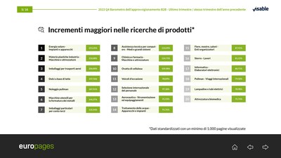 PARIGI , 19 febbraio 2024 /PRNewswire/ -- Ogni secondo, due richieste di ricerca B2B raggiungono europages - la più grande piattaforma di sourcing B2B al mondo - alimentando un enorme flusso di dati che rivelano il comportamento degli acquirenti. Ogni trimestre i nostri analisti esaminano questo barometro dell'attività di approvvigionamento per scoprire le ultime tendenze in materia di approvvigionamento in tutti i settori. I dati del barometro di europages sono altamente affidabili, con oltre 7 milioni di visitatori in tutto il mondo, 3 milioni di acquirenti B2B al mese e oltre 3.000 nuovi profili aziendali ogni mese che offrono prodotti e servizi in 26 lingue.