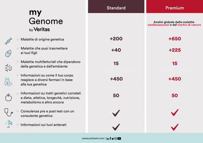 - myGenome Standard, uno strumento chiave nella medicina preventiva che può essere acquistato a 995 euro, offre una versione semplificata del test più completo di Veritas, myGenome Premium. La principale differenza tra i due test è il numero di geni inclusi nell'analisi.
