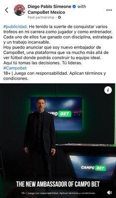 MEXICO CITY , 2 de marzo de 2026 /PRNewswire/ -- Diego Simeone, el legendario técnico en una de las mejores competiciones del mundo, LaLiga, ha anunciado públicamente en Facebook su alianza con CampoBet Mexico. La asociación fue anunciada originalmente en enero de 2026 y representa un paso muy emocionante para CampoBet.