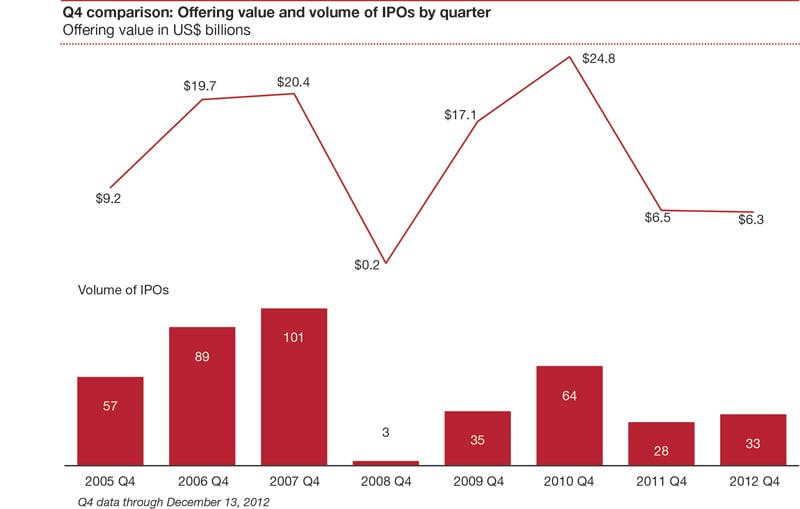 According to PwC, despite the pause in IPO pricings during the fourth quarter, the runway for entering the public markets is active as reflected by the considerable number of companies that are filing under the JOBS act. This underlying volume of activity bodes well for the IPO market as we enter 2013.