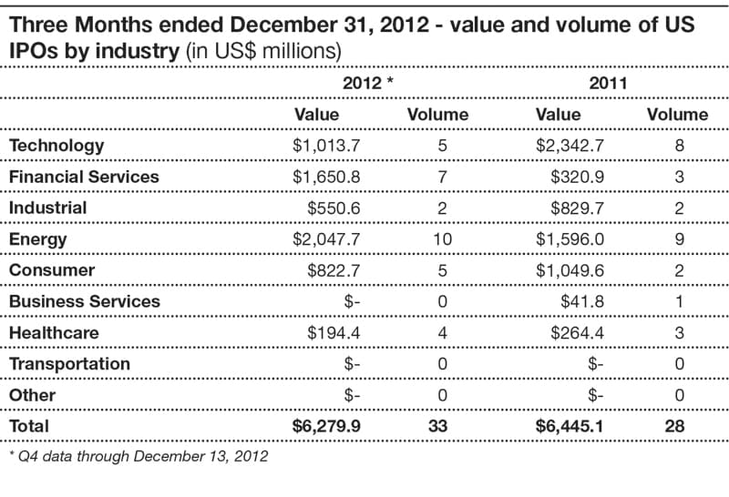 During the fourth quarter of 2012, the energy and financial services sectors, which had ten and seven IPOs respectively, were the leading sectors with 33 percent and 26 percent of the proceeds, respectively.