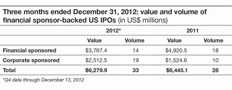 According to PwC, financial sponsors continued to remain active in U.S. IPOs, backing 42 percent of Q4 2012 IPOs and 68 percent of the IPOs on a year-to-date basis. Private equity also remained active in executing on new deals, accounting for 18 percent of total M&A deal volume in 2012, according to PwC's M&A Outlook.