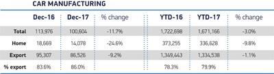 A total of 1,671,166 vehicles rolled off UK production lines in 2017, a -3.0% decrease on 2016 – but still the second highest output since the turn of the century. Export demand from 160 markets worldwide now represents 79.9% of all UK car output – the highest proportion for five years.