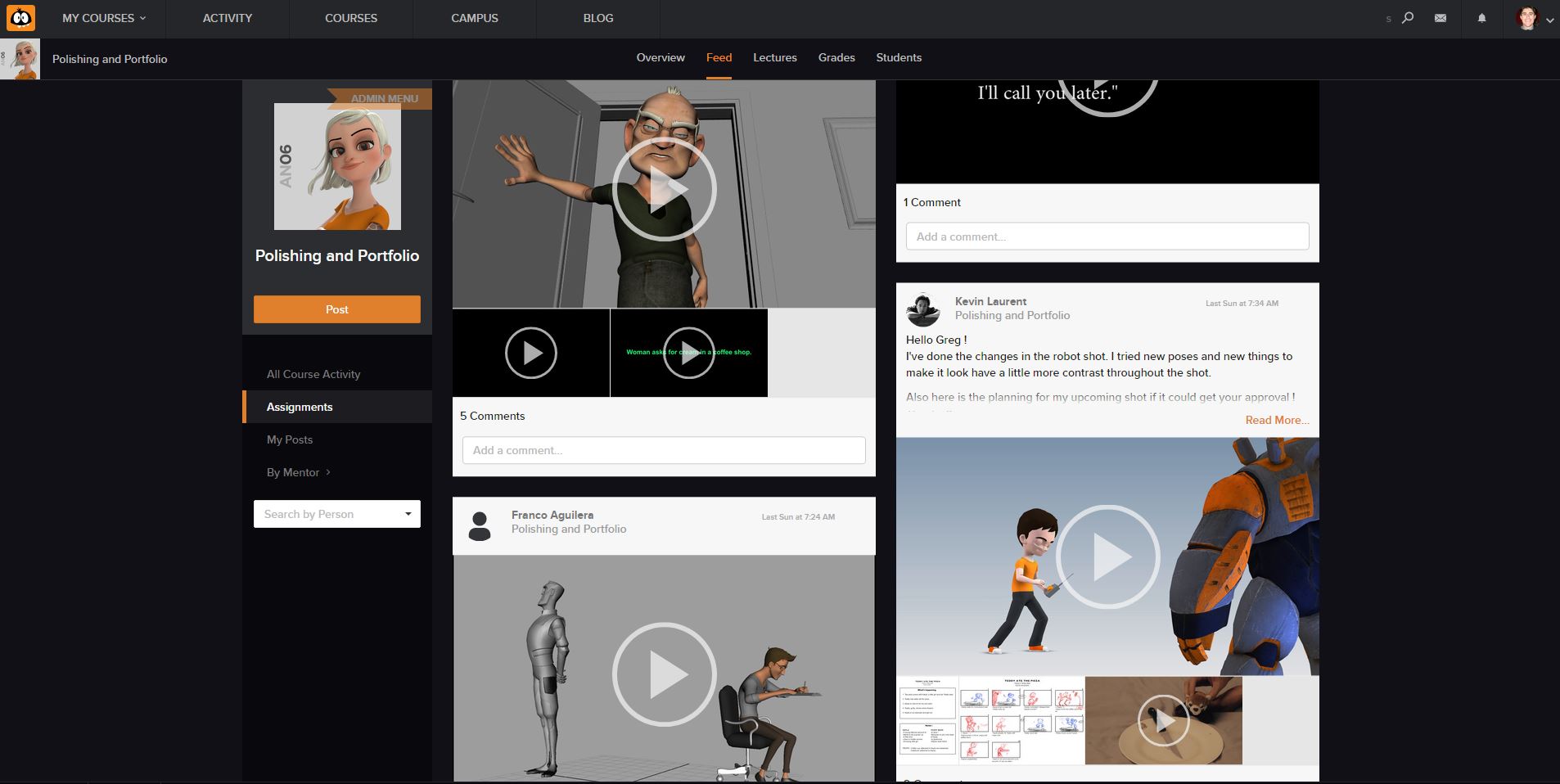Animation Mentor's new campus will offer social-media-style community feeds, allowing students and mentors to customize what they see. In the classroom, they'll see student work, messages, notifications, and stay up to date on critiques and peer feedback. On their personal feed, they'll follow friends, classmates, and others they find inspiring.