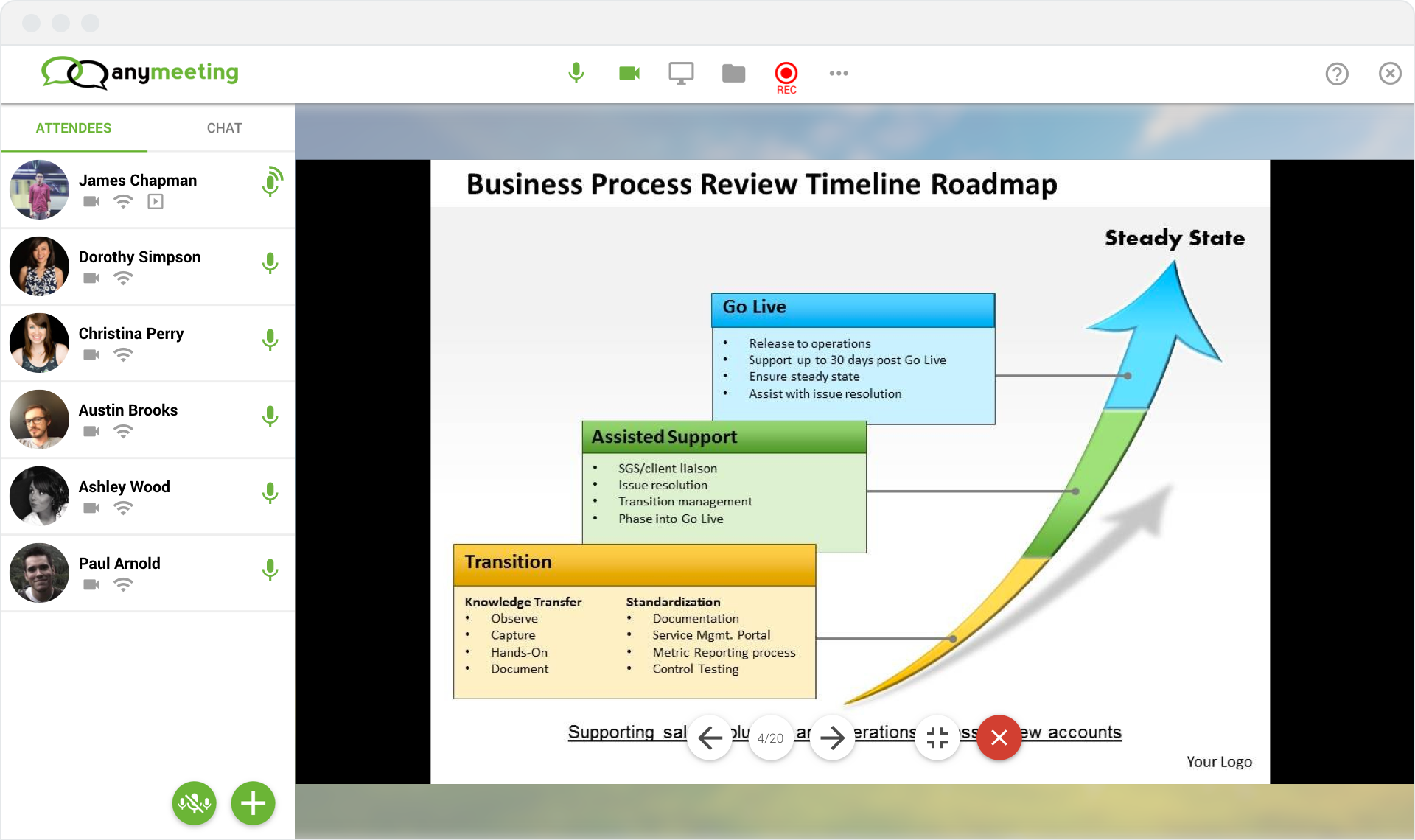 Meeting Pro 4.0 introduced the next generation of the AnyMeeting web conferencing platform. It has a completely refreshed user interface, built on full WebRTC audio and video capabilities, 720p HD video conferencing, brand new iOS and Android mobile apps, and a more natural and engaging paradigm for online meeting participation that incorporates rich attendee profiles based on social media information, emojis, and more. It also eliminated the need for meeting hosts to download the web conferencing platform prior to joining meetings.