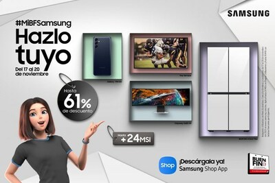 CIUDAD DE MÉXICO , 16 de noviembre de 2023 /PRNewswire/ -- Para aprovechar este fin de semana al máximo, Samsung tendrá descuentos de hasta el 50%* en celulares, tabletas y smartwatches Galaxy; y para quienes deseen una nueva Smart TV, renovar su monitor o cambiar de electrodoméstico habrá descuentos de hasta el 61%*, todo hasta con 24 MSI.