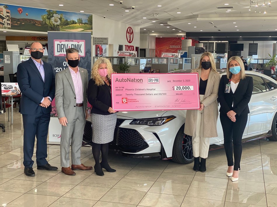 PHOENIX, Dec. 7, 2020 /PRNewswire/ -- AutoNation, Inc. (NYSE: AN), AutoNation, America's largest and most recognized automotive retailer, presented a $20,000 check to Phoenix Children's Hospital at AutoNation Toyota Tempe on Thursday, December 3. Funds were raised through AutoNation's cash register charity program and the support of the community and Associates at AutoNation stores in Arizona. With a donation program in place at all point of purchase terminals, Customers make donations to the charity by adding an amount to their credit card, 100% of which goes directly to the charity.