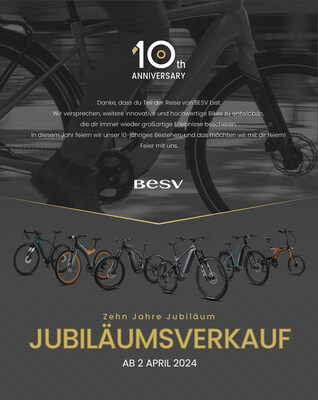 VELDHOVEN, Netherlands, 18. April 2024 /PRNewswire/ -- Die E-Bike-Marke BESV geht in ihr zehntes Jahr seit ihrer Einführung im Jahr 2014. BESV strebt weiterhin nach Spitzenleistungen in der Produktforschung und Produktentwicklung und hält sich dabei an die Grundprinzipien der Marke: Beautiful, Eco-Friendly, Smart, Vision. Mit Blick auf den Benutzer wird die fortschrittlichste Technologie eingesetzt, um eine perfekte Lösung für grüne Energie und Mikromobilität zu schaffen: BESV Premium-E-Bikes. Gleichzeitig ist BESV bestrebt, umweltbewusst zu produzieren und grüne Mobilität zu praktizieren. Im Laufe der Jahre hat BESV erfolgreich verschiedene internationale Märkte erschlossen und bietet BESV-Besitzern auf der ganzen Welt die Möglichkeit ihren Slogan „Experience Amazing" zu erleben