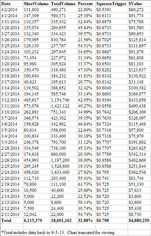 SqueezeTrigger - 40 billion cell database tracks EVERY short sale (not just total short interest) in all US stocks and calculates volume weighted price that a short squeeze will begin in each stock.