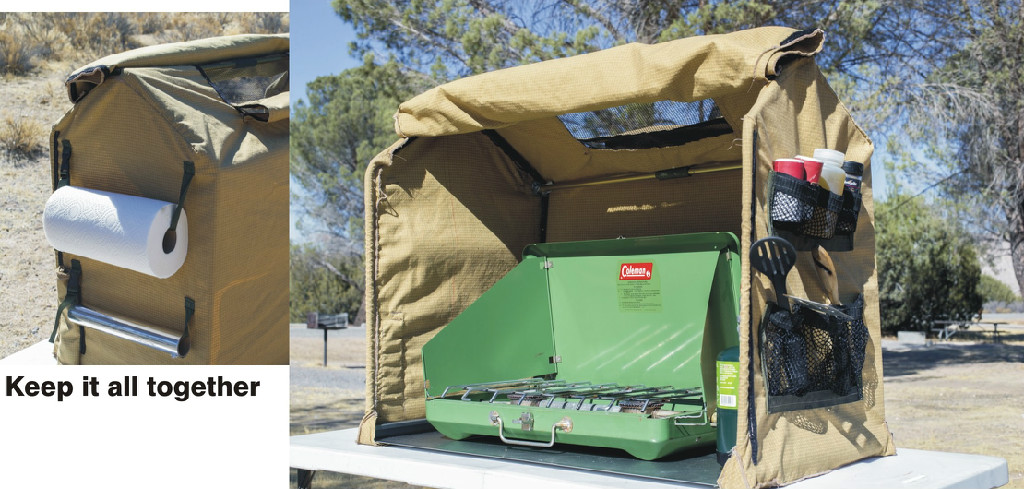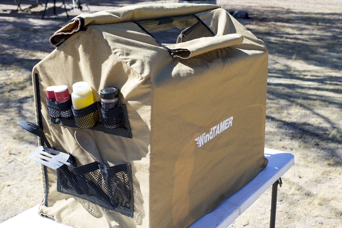 With three decades of freelance design work behind him, Schliebs began taming the wind at Mojave Narrows using a sheet of Nomex stretched over the front of the campground grill, laying the groundwork for his initial design. The WindTamer provides a Nomex shield with a steel stand that protects the stove from the elements. It's quick and easy to set up and vents at the top. It's also large enough to accommodate a three burner stove and offers pockets and holders on the sides for paper towels, foil, and other cooking utensils for convenience and organization. While providing easy access to the burners, it also saves on the amount of fuel utilized by the stove and is reusable saving money over time.
