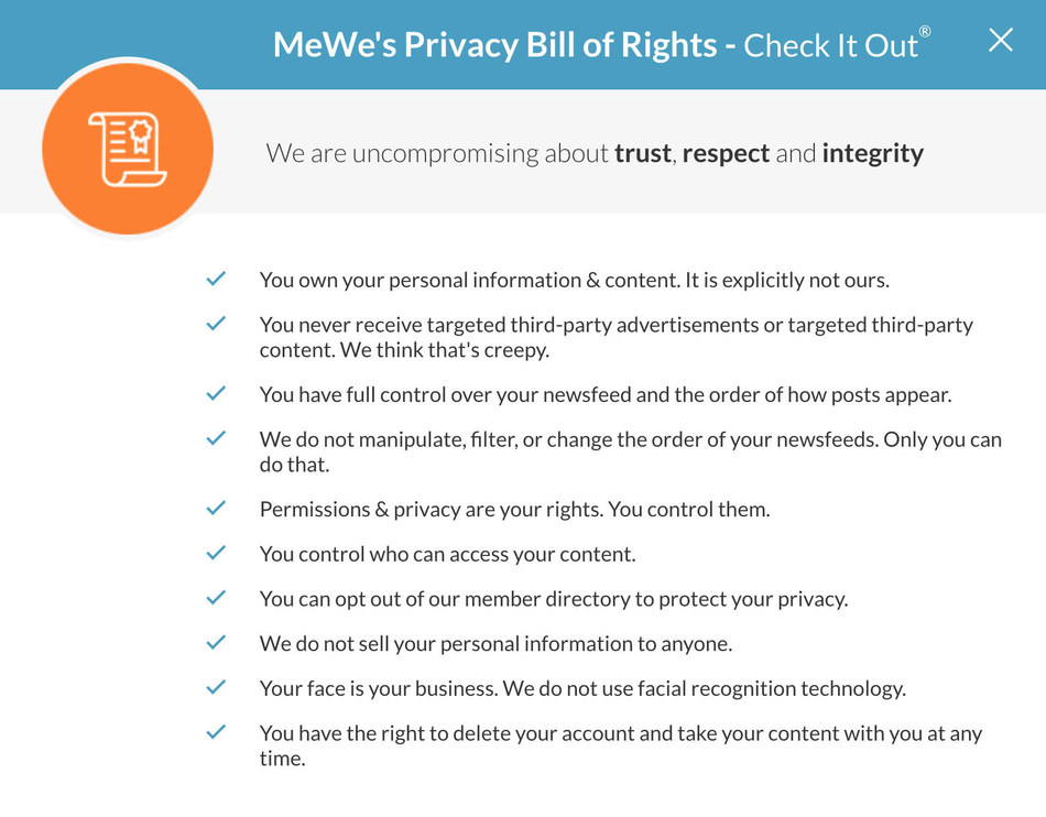 MeWe's groundbreaking "Privacy Bill of Rights" guarantees members have control of their data, newsfeeds and privacy. MeWe safeguards members with a strong Terms of Service designed to keep bad actors out.
