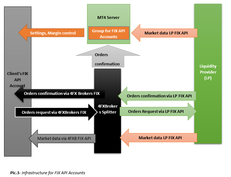 Quotes from the master account are transmitted through the master FIX API protocol to 4FXBrokers FIX API Splitter and are then retransmitted through the 4FXBrokers FIX API protocol to numerous client accounts. Orders from client accounts are transmitted through 4FXBrokers FIX API to 4FXBrokers FIX API Splitter and then through master FIX API to the master account.