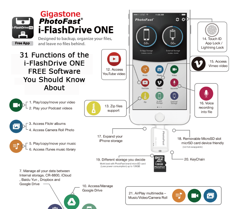 Primarily, the Gigastone i-FlashDrives let iPhone and iPad users to free up much needed memory. They also deliver a portable "off the Cloud" storage solution. Keep your data in your pocket. The process is simple;