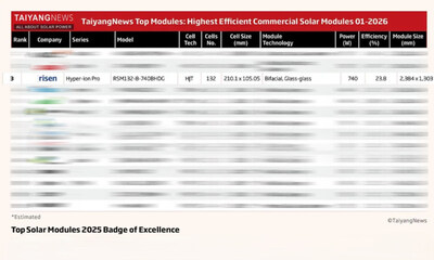 NINGBO, China, Jan. 23, 2026 /PRNewswire/ -- Recently, global PV authority TaiyangNews released its inaugural 2026 TOP SOLAR MODULES list. Risen Energy's Hyper-ion Pro HJT modules secured a position among the global top three, backed by a hardcore mass-production power rating of 740Wp and a conversion efficiency of 23.8%.