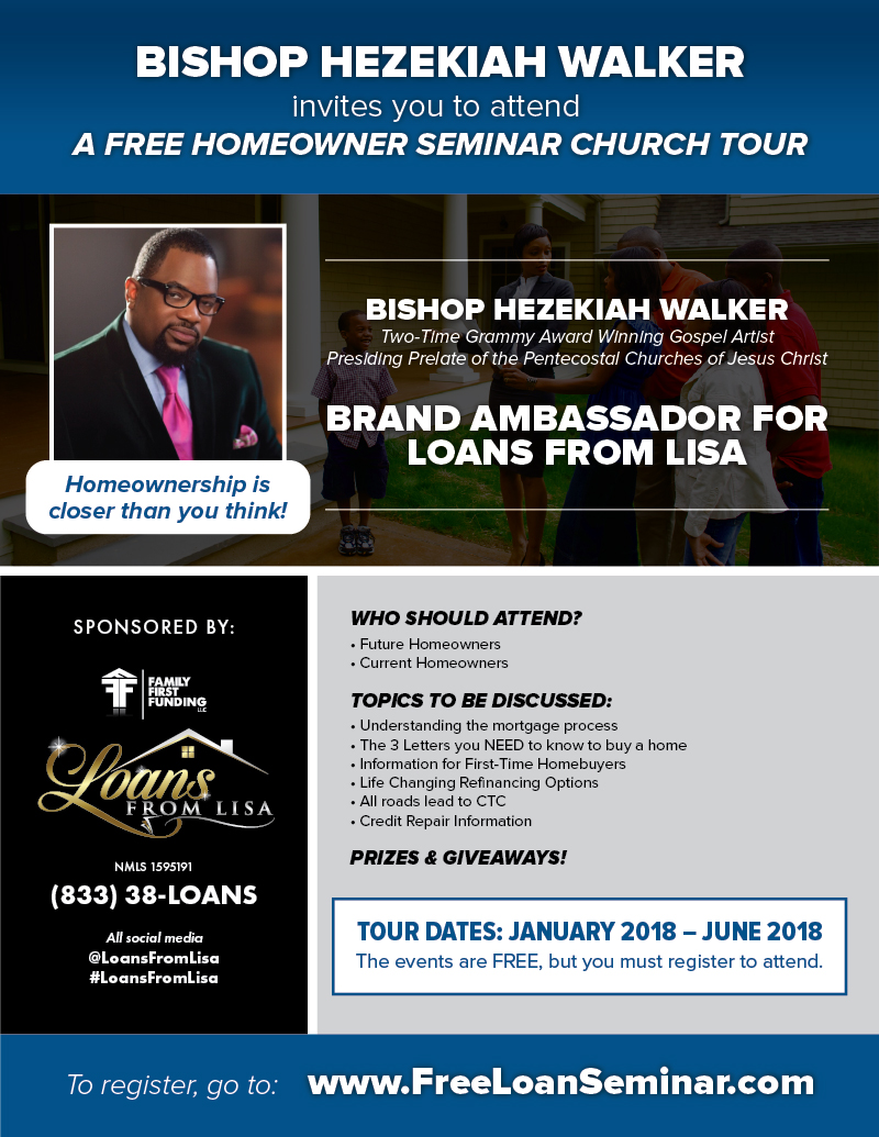PHILADELPHIA, Nov. 17, 2017 /PRNewswire/ -- Bishop Hezekiah Walker and LOANS FROM LISA take the mortgage industry by storm with a first-time-ever nationwide Mortgage Seminar Church Tour. The founder and senior pastor of the Love Fellowship Tabernacle Churches, Bishop Hezekiah Walker becomes the Brand Ambassador for LOANS FROM LISA. This is the first time that a free Nationwide Homeowner Seminar Church Tour, spanning 42 cities across the country, has been done for communities, featuring a two-time Grammy Award-winning gospel artist as the brand ambassador in partnership with a direct mortgage banker.