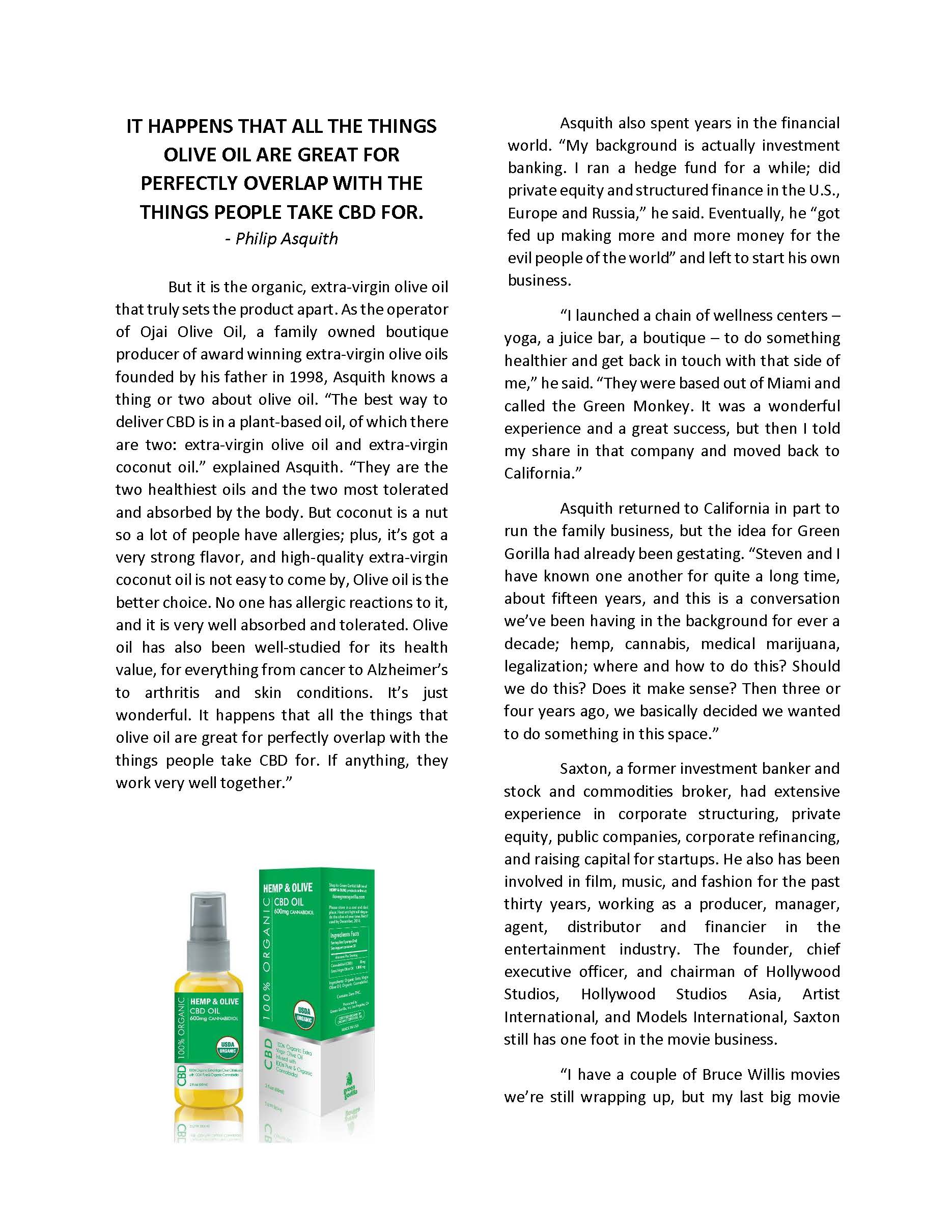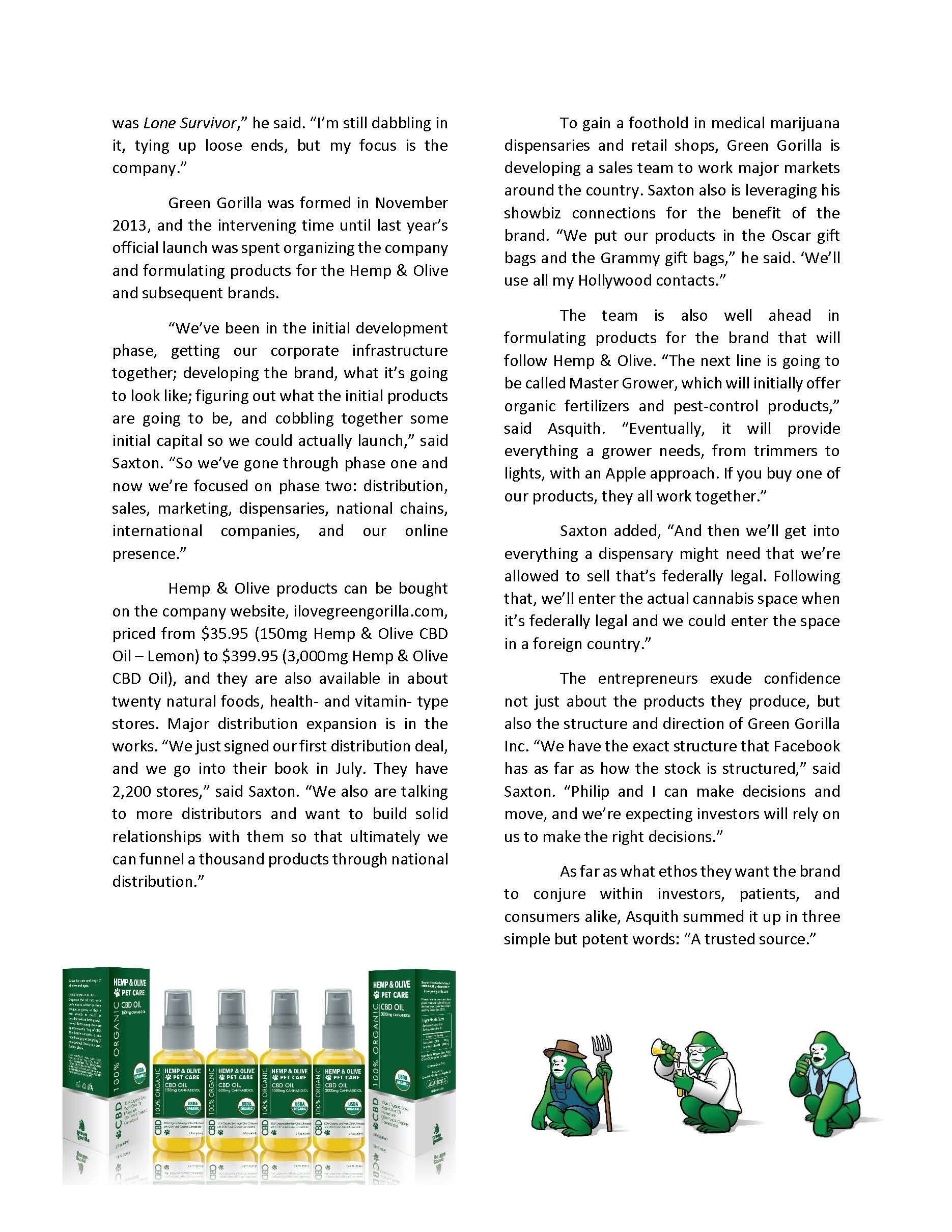 Hemp & Olive products can be bought on the company website, ilovegreengorilla.com, priced from $35.95 (150mg Hemp & Olive CBD Oil – Lemon) to $399.95 (3,000mg Hemp & Olive CBD Oil), and they are also available in about twenty natural foods, health- and vitamin- type stores. Major distribution expansion is in the works. "We just signed our first distribution deal, and we go into their book in July. They have 2,200 stores," said Saxton. "We also are talking to more distributors and want to build solid relationships with them so that ultimately we can funnel a thousand products through national distribution."
