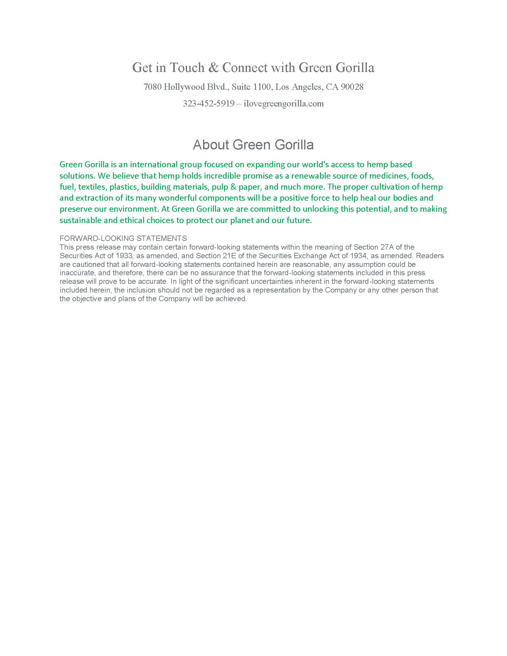About Green Gorilla: Green Gorilla is building an international brand in the hemp and cannabis industries. Our mission is to provide sustainable and ethical goods and services to a broad range of customers, with a primary focus on health and wellness. Green Gorilla prides itself on being a sustainable and ethical company utilizing hemp to provide people with tools to live healthier and happier lives, while also preserving and protecting our planet. While federal policy is developing, the Company will operate only in areas that are unequivocally federally legal, and is initially focused entirely on hemp based products. The company is building a multitude of market leading product lines centered around hemp and the picks and shovels of the cannabis industry, as well as a state of the art web portal addressing a wide range of related goods, services, online interaction, and education. Green Gorilla was established in 2013 by founders Philip J.P. Asquith and Sir Steven Saxton.
