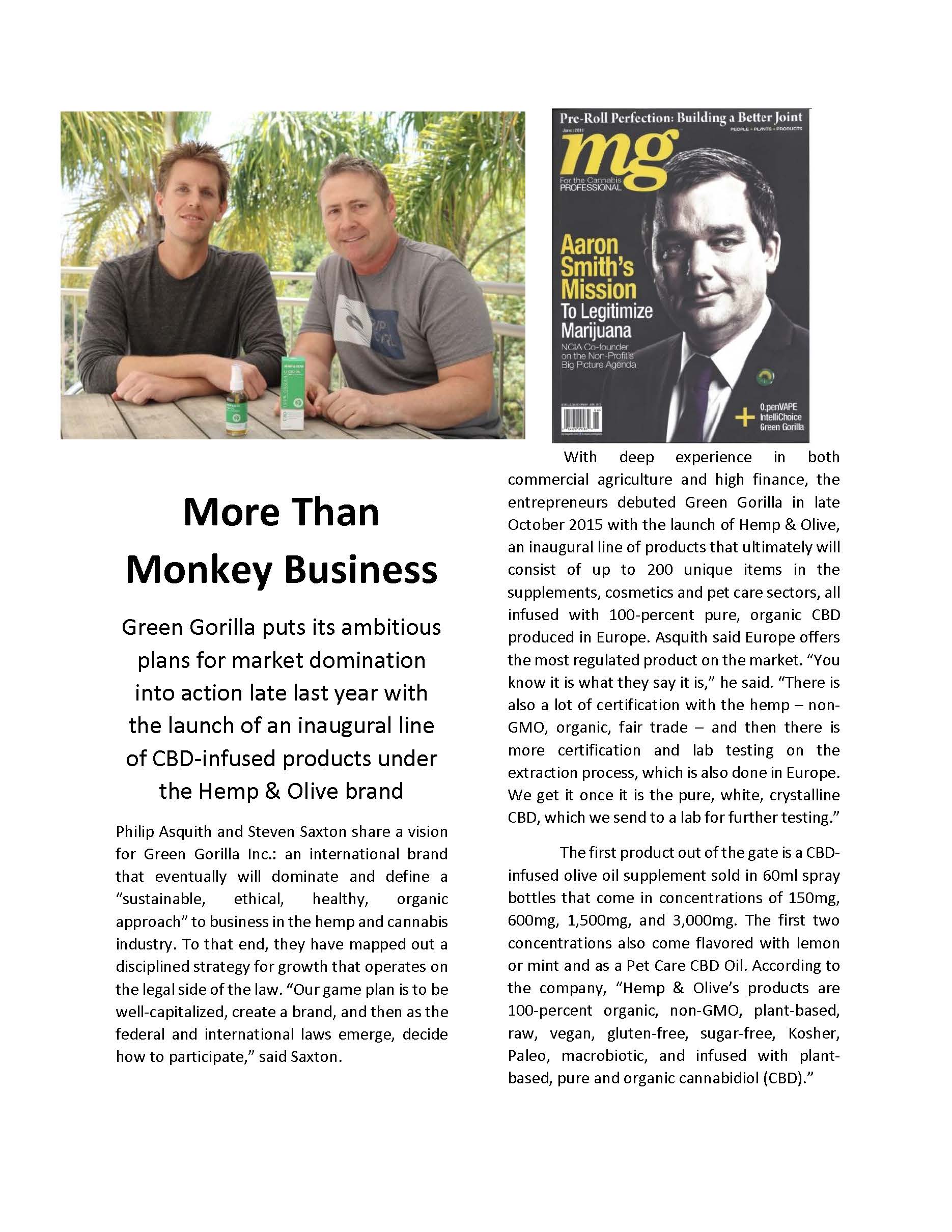 LOS ANGELES, June 15, 2016 /PRNewswire/ -- Green Gorilla's Hemp and Olive CBD Line (www.ilovegreengorilla.com) is featured in the current (June) issue of mg Magazine, the Cannabis industry's popular and top-rated Business to Business monthly publication.