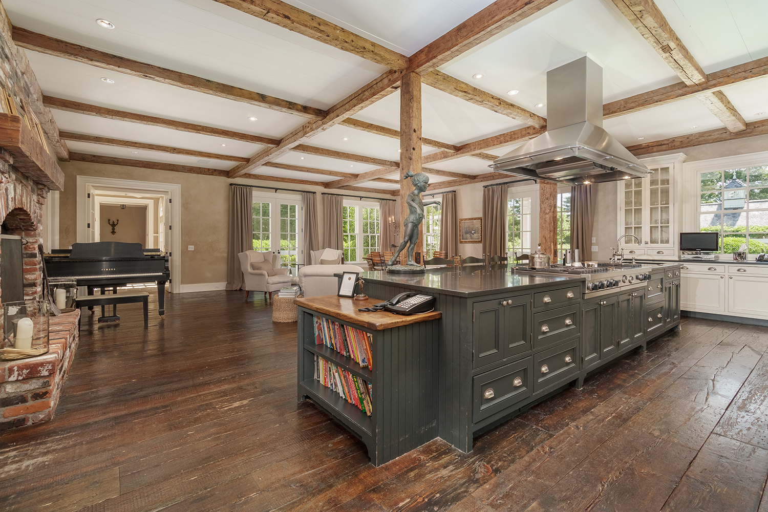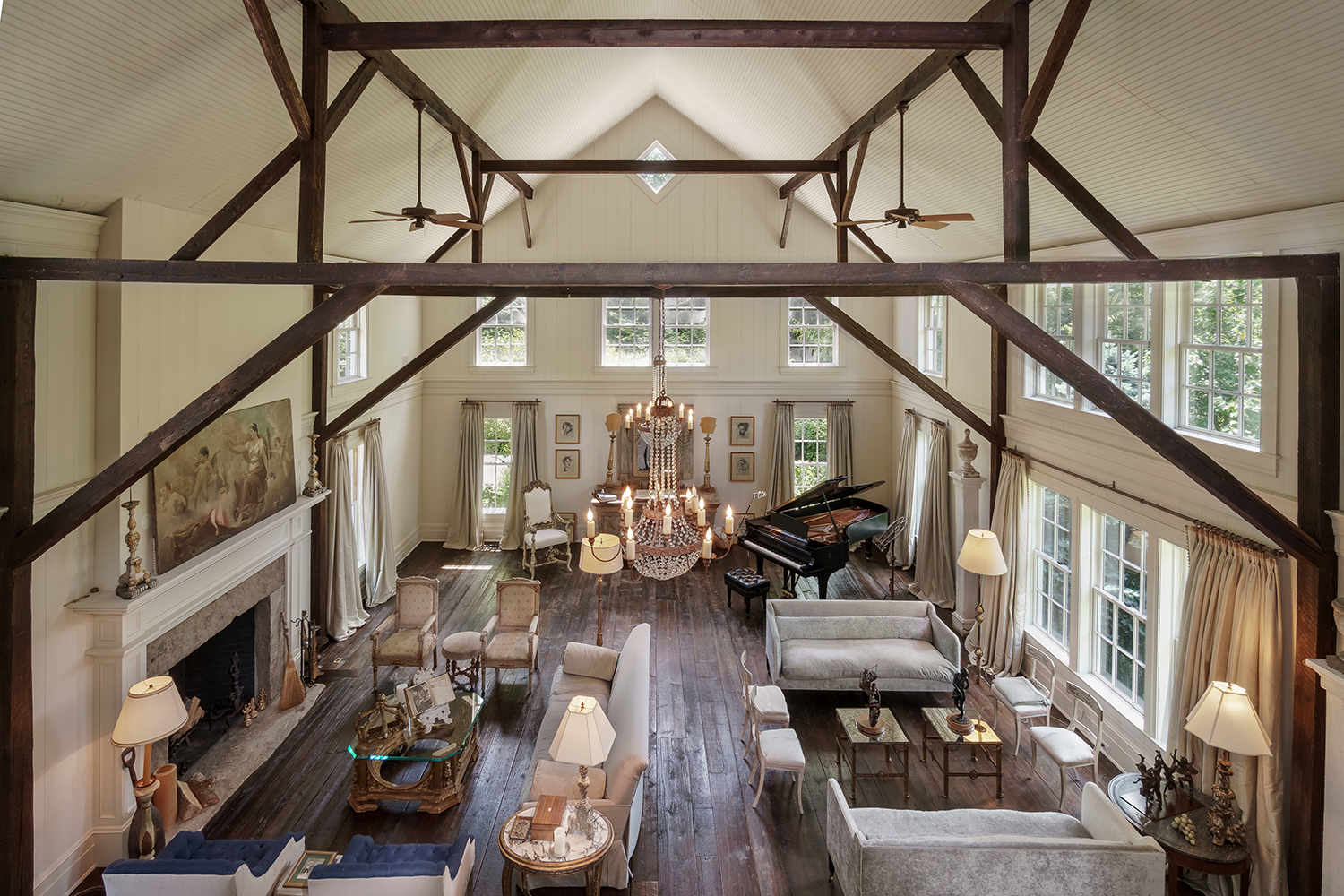 Completely remodeled and updated by Mark Finlay Architects, the 11,598 square foot antique barn features seven bedrooms, including master bedroom with fireplace and French doors leading to a balcony overlooking the heated pool; six full baths and two half-baths; a kitchen, family room and library with reclaimed chestnut from the original structure; massive stone floors from the south of France throughout the home; and, matching cupolas on the main house, main barn and pool house. Two of the barns on the property are outfitted, respectively, with a recording studio and gym.