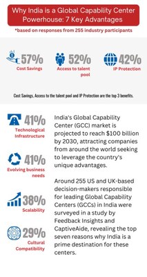 BENGALURU, India, Sept. 9, 2024 /PRNewswire/ -- India's Global Capability Center (GCC) market is set for unprecedented expansion, with over 250 new centers expected in the next 3-5 years, according to a new study by CaptiveAide and Feedback Insights. The report, 'Back to the Future: What You Didn't Know About Setting Up a Successful GCC in India – Today,' surveyed 255 US and UK decision-makers, revealing key insights into this burgeoning sector.