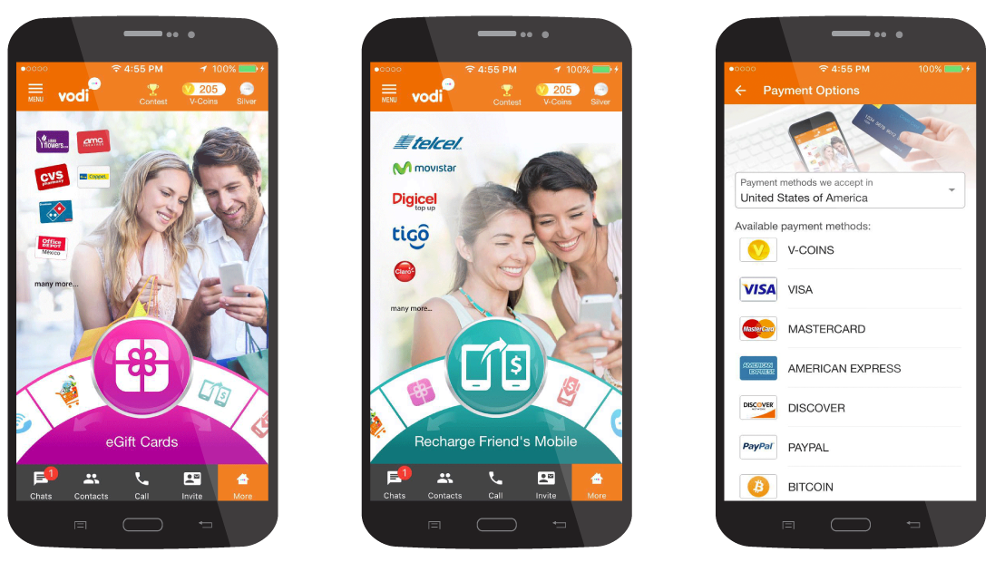 Vodi offers enhanced messaging, voice calling and video calling applications, combined with unique conversational commerce services, instant mobile eGift delivery and prepaid mobile recharge capability—all in one app.