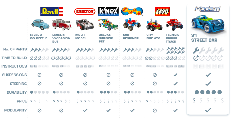 The average child already has too many toys—creating a situation where none are appreciated, or hold anyone's attention, for very long. Modarri's system of modular cars appeals to every child's need to be challenged: introducing one new quarter at a time presents a situation where she can experience exponential amounts of new car combinations with each new piece added to the collection. The craftsmanlike quality of Modarri cars ensure that they stand up to years of experimentation and collisions!—while teaching every collector at a young age that every part should be acknowledged, creating a tradition of amassing fewer, more high quality and adaptable toys. The change in play habits is greener, more economical, and constructive, as well as more environmentally sustainable.