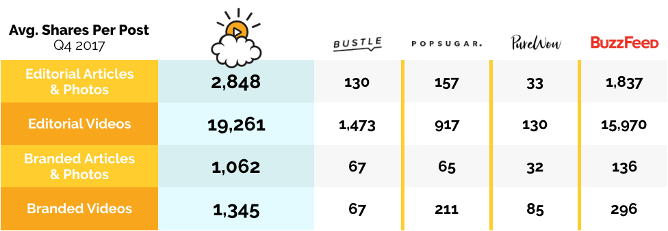 LittleThings leads other players in the space (including BuzzFeed, PopSugar, Bustle, and PureWow) in shares per post — a key measure under this new algorithm — across all content types.