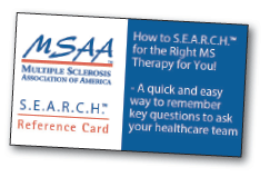 MSAA provides free programs and services, such as: a Helpline with trained specialists; award-winning publications, including MSAA's magazine, The Motivator; MSAA's nationally recognized website (at mymsaa.org), featuring award-winning educational videos and research updates; S.E.A.R.C.H.™ program to assist the MS community with learning about different treatment choices; a mobile phone app, My MS Manager™ (named one of the best multiple sclerosis iPhone & Android apps by Healthline.com); a resource database, My MS Resource Locator; safety and mobility equipment distribution; cooling accessories for heat-sensitive individuals; educational events held across the country; MRI funding; and more. For additional information, please visit www.mymsaa.org or call (800) 532-7667.