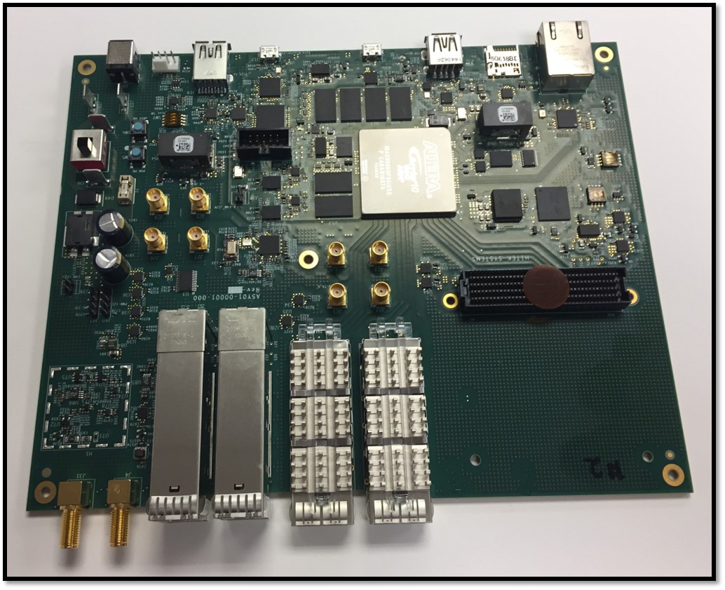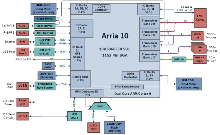 Front panel connectors include: Dual QSPF+ ports for 40G, Quad SFP+ ports for 10G/1G, SMA connectors for external clock and sync (1PPS/IRIG) and an FMC interface. Rear panel connectors include: GigE interface to the Arria SoC HPS, Type A USB Host port, Micro-USB port access to HPS processor, Micro-USB port for ByteBlaster II access and 1x PCIe slave interface. A data brief with details of the modules features can be downloaded from this link HTK-ARRIA-10-SOC-MOD.