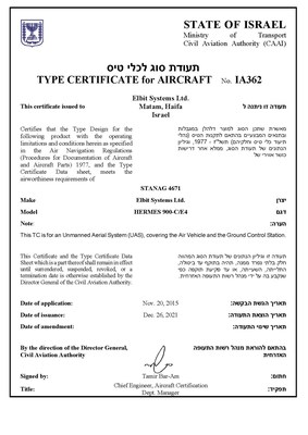 JERUSALEM, 15. Februar 2022 /PRNewswire/ -- Zum ersten Mal überhaupt hat die Zivilluftfahrtbehörde des Staates Israel (CAAI), die dem israelischen Ministerium für Verkehr und Straßensicherheit untersteht, ein unbemanntes Luftfahrtsystem (UAS) für die Zivilluftfahrt zertifiziert. Damit wurde ihm die Genehmigung erteilt, wie jedes andere zivile Flugzeug im zivilen Luftraum zu fliegen.
