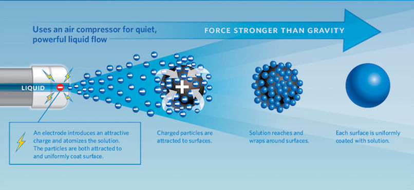 This new technology works by electrically charging a fine mist or spray of clean water and organic cleaner. The electrostatic mist creates a powerful "storm" of natural magnetic attraction between the sprayer nozzle and treatment area that is upwards of 75 times the force of gravity. After the mist is activated, the droplets reverse direction when passing a treatment area, moving upwards against gravity, covering a full 360 degrees of a treatment area due to a naturally occurring phenomenon called electrostatic "wraparound".