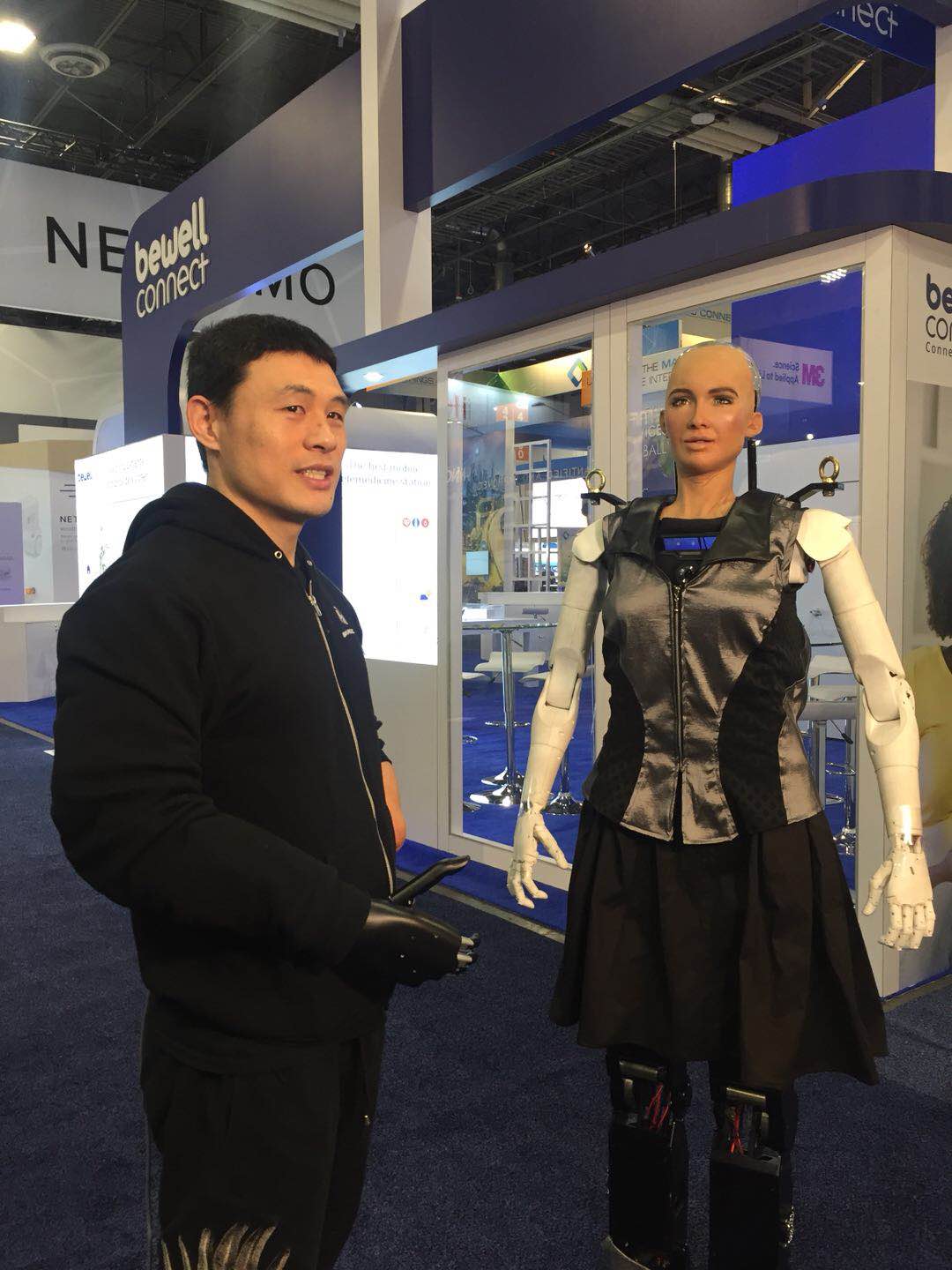 Double Amputee Athlete Mincheng Ni Wears BrainRobotics' Smart Prosthetic Hand and Interacts with Sophia, the World's First Robot Citizen from Saudi Arabia
