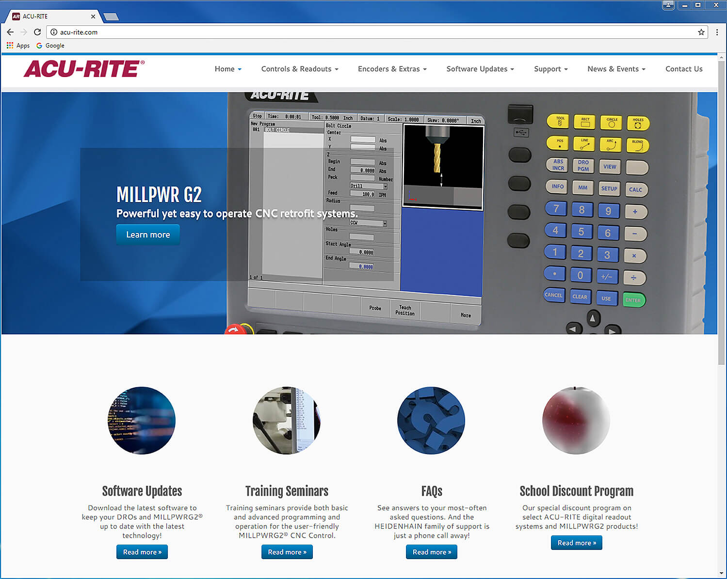 New software uploads for product such as for the popular MILLPWRG2 CNC control are now easily found, and free to customers. Also details about ACU-RITE's popular School Discount Program are now clearly available online.